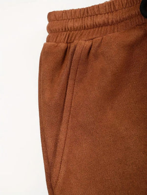 Men's Suede-Look Tracksuit Set Two-Piece Set: Includes a full-zip bomber jacket and matching jogger pants. Color & Fabric: Rich, rust-brown color with a textured, soft, suede-like or velvet-touch finish. Jacket Style: Features black contrast ribbing on the collar, cuffs, and hem (typical of a bomber). Branding: Both pieces display a black crest/shield logo with an 'R' on the chest and upper l